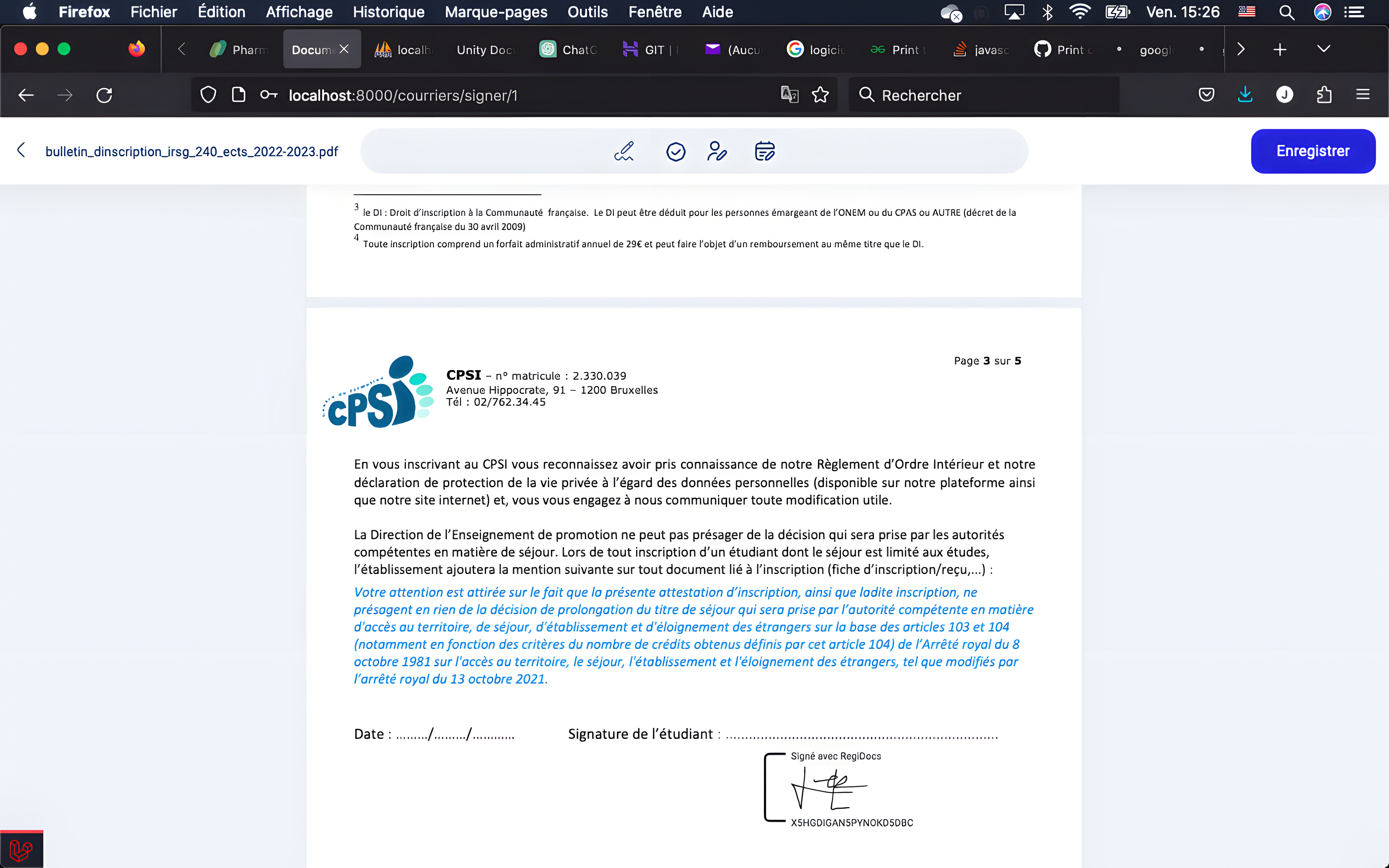 Les plus grandes difficultés rencontrées ont été lors de l'implémentation du module de signature électronique et de celui de génération automatique des documents. Le défi consistait à assurer une sécurité robuste et une intégration fluide pour garantir l'authenticité et la validité des documents signés numériquement.